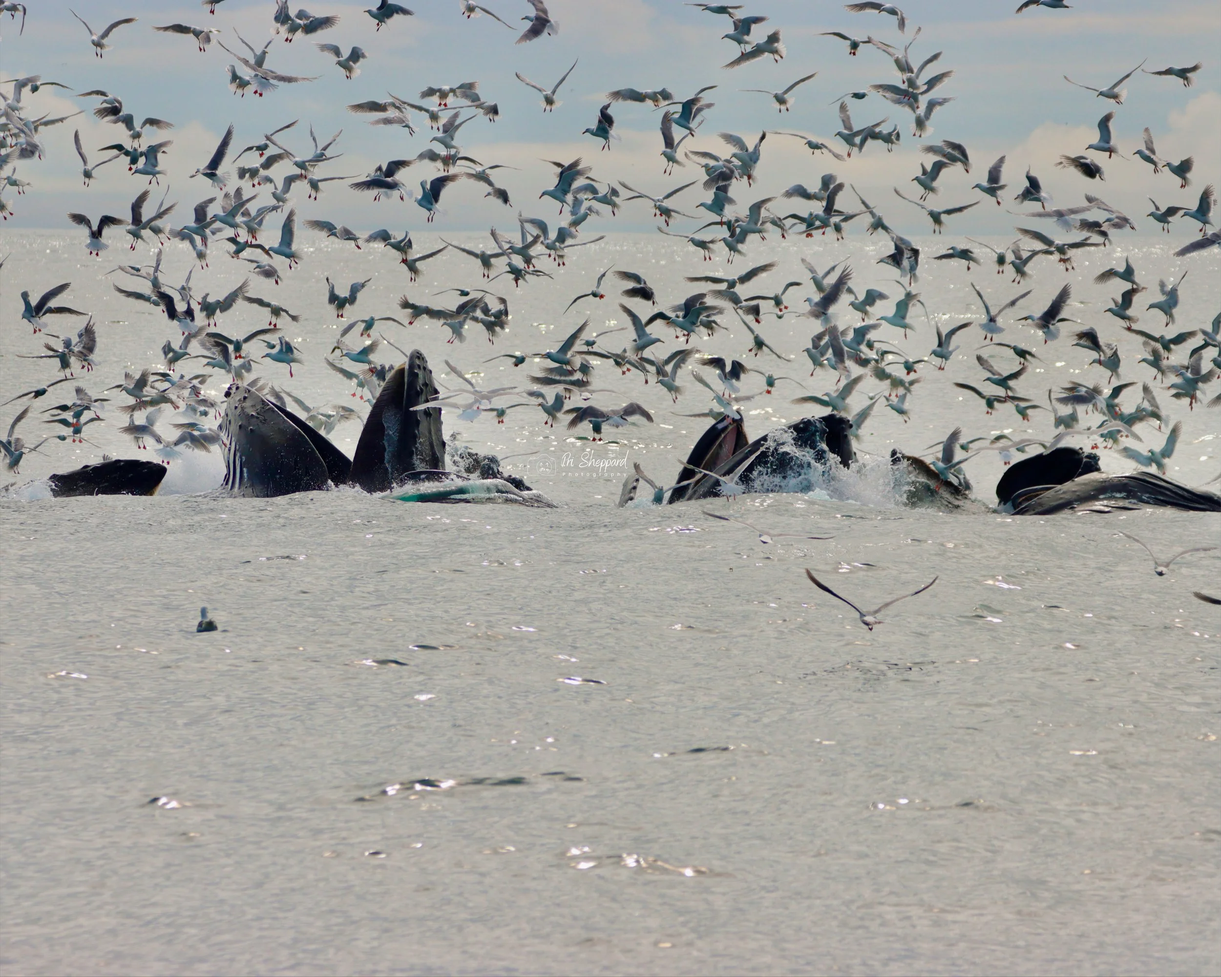 Rare White Raven. Male moose in autumn in Denali Park. Sea lion feeding on salmon. Humpback whales feeding.